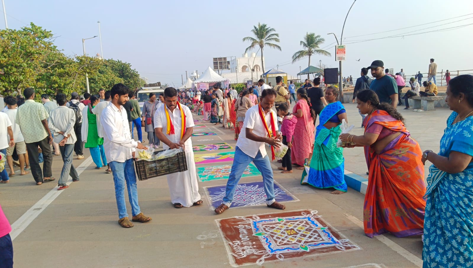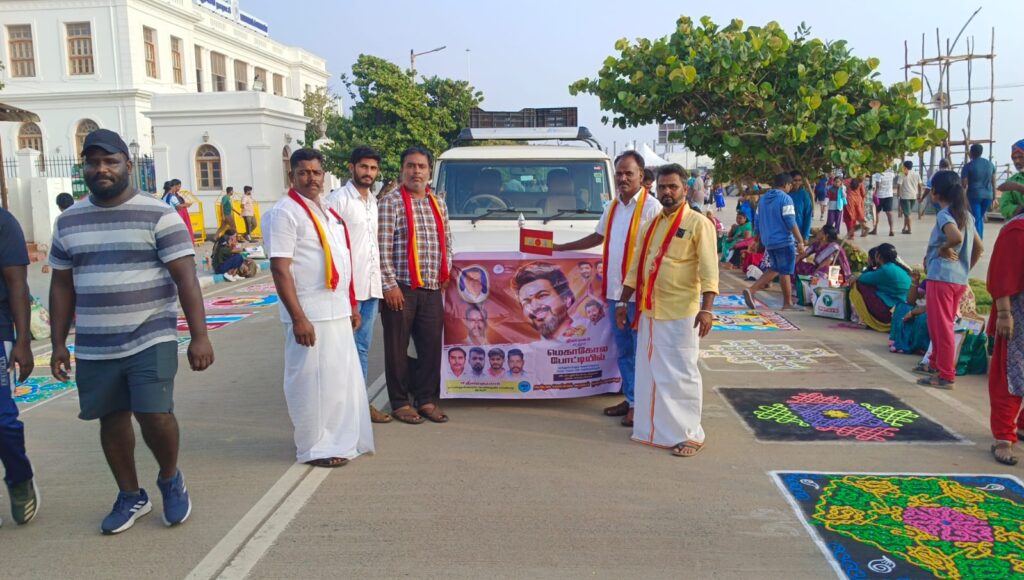 புதுச்சேரியில் நடைபெற்ற கோலப்போட்டியில் தமிழக வெற்றி கழகம் கிருஷ்ணகிரி மாவட்டம் ஓசூர் பூபதி முருகேஷ் துரை திய உல்லா இலியாஸ் இவர்கள் தலைமையில் புதுச்சேரி தனியார் நாளிதழ் நடத்திய கோலப்போட்டியில் பங்கு பெற்றோர்களுக்கும் ஒரு கிலோ அளவுள்ள ஏலைக்கி வாழைப்பழம் ஆயிரத்துக்கும் மேற்பட்டோர்களுக்கு வழங்கினார்கள் இந்நிகழ்ச்சியில் ஆயிரத்துக்கும் மேற்பட்ட பொதுமக்கள் கலந்து கண்டு வாழப் பழங்களை வாங்கி சென்றனர்