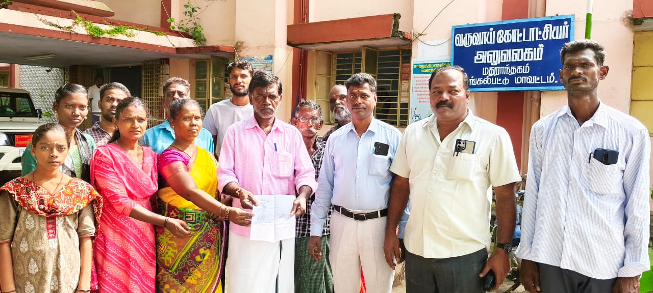 சாலை வசதி கேட்டு மதுராந்தகம் கோட்டாட்சியரிடம் மனு வழங்கினர்.