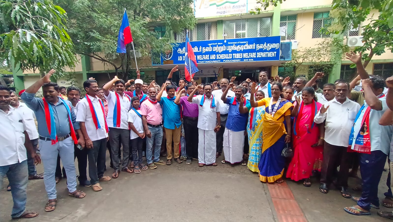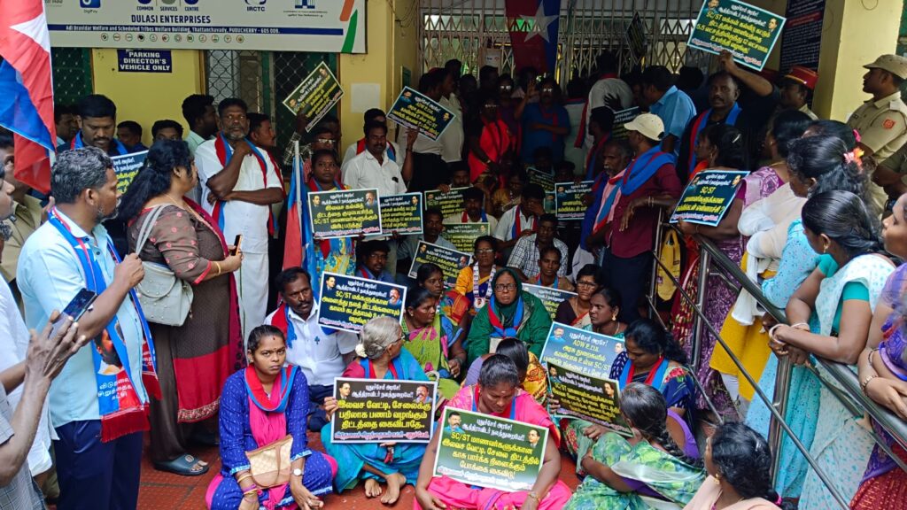 இந்த திட்டத்தை கைவிட்டு மீண்டும் இலவச வேட்டி – சேலை திட்டத்தை கொண்டு வரும் ஆதிதிராவிடர் நலத்துறை அமைச்சர் சாய். சரவணன் குமார், மற்றும் இயக்குனர் இளங்கோவனை கண்டித்தும்,SC/ST மக்களுக்கு இலவச மானைபட்டா உடனடியாக பட்டா வழங்கிட வலியுறுத்தி புதுச்சேரி விடுதலை சிறுத்தைகள் கட்சியினர் ஆதிதிராவிட நலத்துறை அலுவலகத்தை இழுத்து பூட்டு போட்டு பூட்டி போராட்டத்தில் ஈடுபட்டனர்.