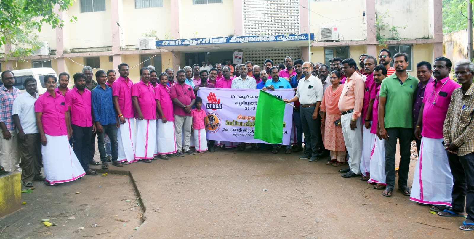 விருத்தாசலத்தில் திருமுதுகுன்றம் போட்டோ & வீடியோ கலைஞர்கள் நல சங்கம் சார்பில் நடைபெற்ற போதைப் பொருள்கள் ஒழிப்பு விழிப்புணர்வு பேரணியை விருத்தாசலம் கோட்டாட்சியர் சையத் மொகமத் கொடியசைத்து துவக்கி வைத்தார்
