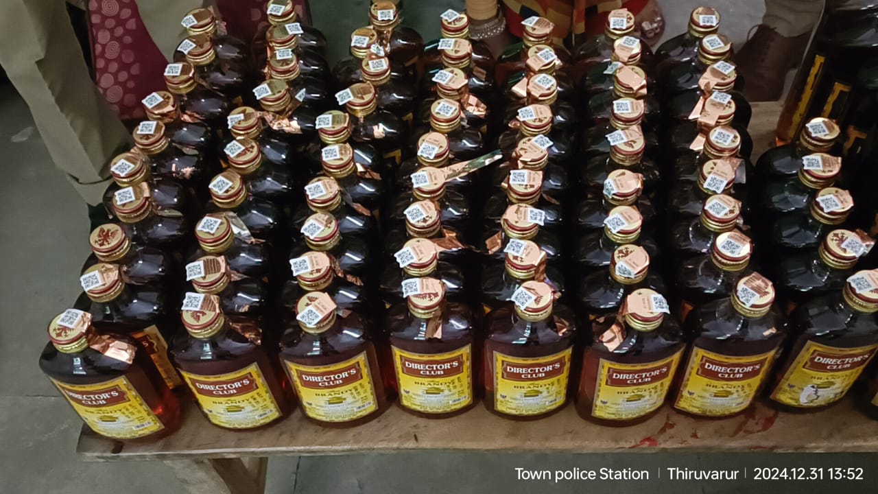 திருவாரூர் மாவட்டத்தில் திருவாரூர் பேருந்து நிலையத்தில் இன்று திருவாரூர் நகர காவல் துறையினர் சாதாரண பணியில் இருந்த பொழுது, அரசு பேருந்தில் பாண்டிச்சேரி மது பாட்டில்கள் கடத்தி வருவதாக வந்த தகவலை அடுத்து, நகர காவல் துறையினர் பேருந்துகளில் சோதனை மேற்கொண்டார்கள் .