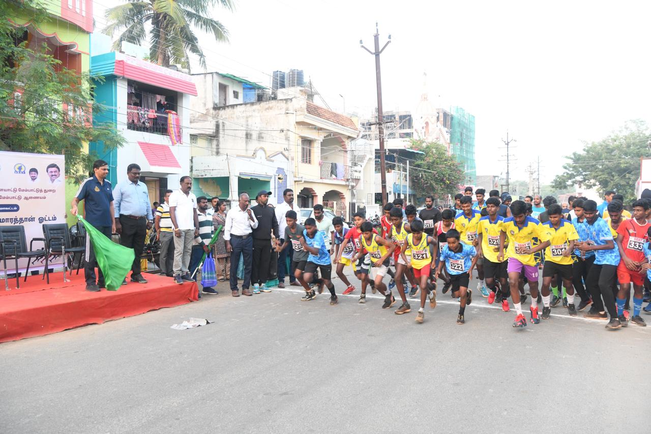 அதனை தொடர்ந்து தூத்துக்குடி மாவட்ட விளையாட்டு அரங்கில் 25 வயதிற்குட்பட்ட வீரர்களுக்கு 8 கி.மீ. வீராங்கனைகளுக்கு 5 கி.மீ. மற்றும் 25 வயதிற்கு மேற்பட்ட வீரர்களுக்கு 10 கி.மீ.. வீராங்கனைகளுக்கு 5 கி.மீ. என தனித்தனியாக போட்டிகள் நடைபெற்றது.