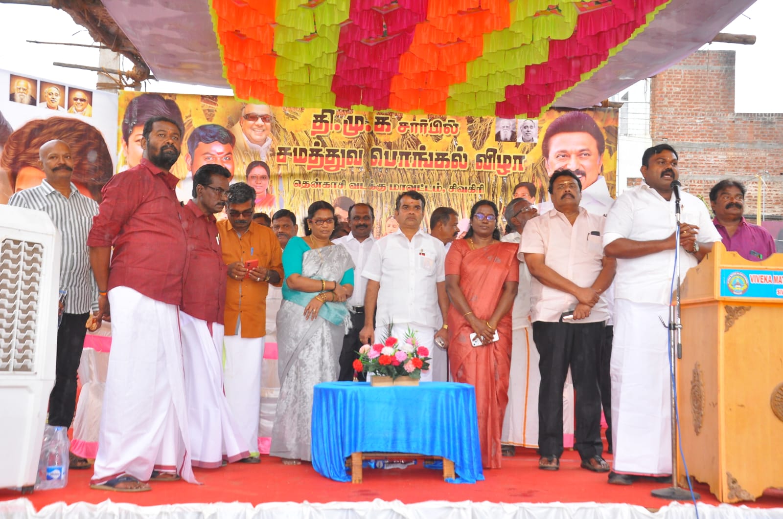 தென்காசி மாவட்டம் சிவகிரியில் 11வது வார்டு திமுக சார்பில் தை திருநாளை முன்னிட்டும், கலைஞரின் 101வது பிறந்த நாளை முன்னிட்டும் 101 மகளிர் பங்கேற்ற சமத்துவ பொங்கல் விழா நடைபெற்றது. தென்காசி வடக்கு மாவட்ட திமுக செயலாளர் எம் எல் ஏ ராஜா தலைமை தாங்கி துவக்கி வைத்தார்.