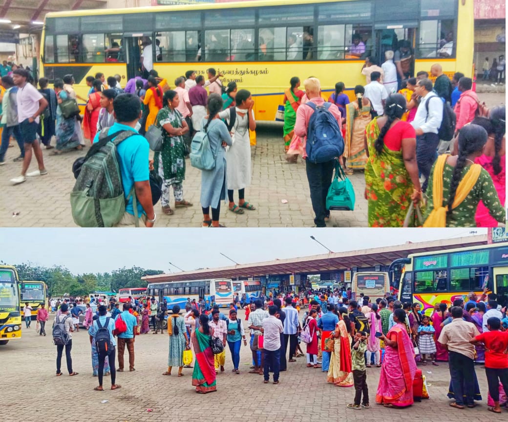 வழக்கமாக ஞாயிற்றுக்கிழமை களில் நிலையத்திற்கு ரயில் மக்கள் வருகை குறைவாக இருக்கும். ஆனால் இன்று மதுரை ரயில் நிலையம் மக்கள் கூட்டத்தால் நிரம்பி வழிந்தது. இது போல் ஆரப்பாளையம் பஸ் நிலையமும் பயணிகள் கூட்டத்தால் நிரம்பி வழிகிறது.