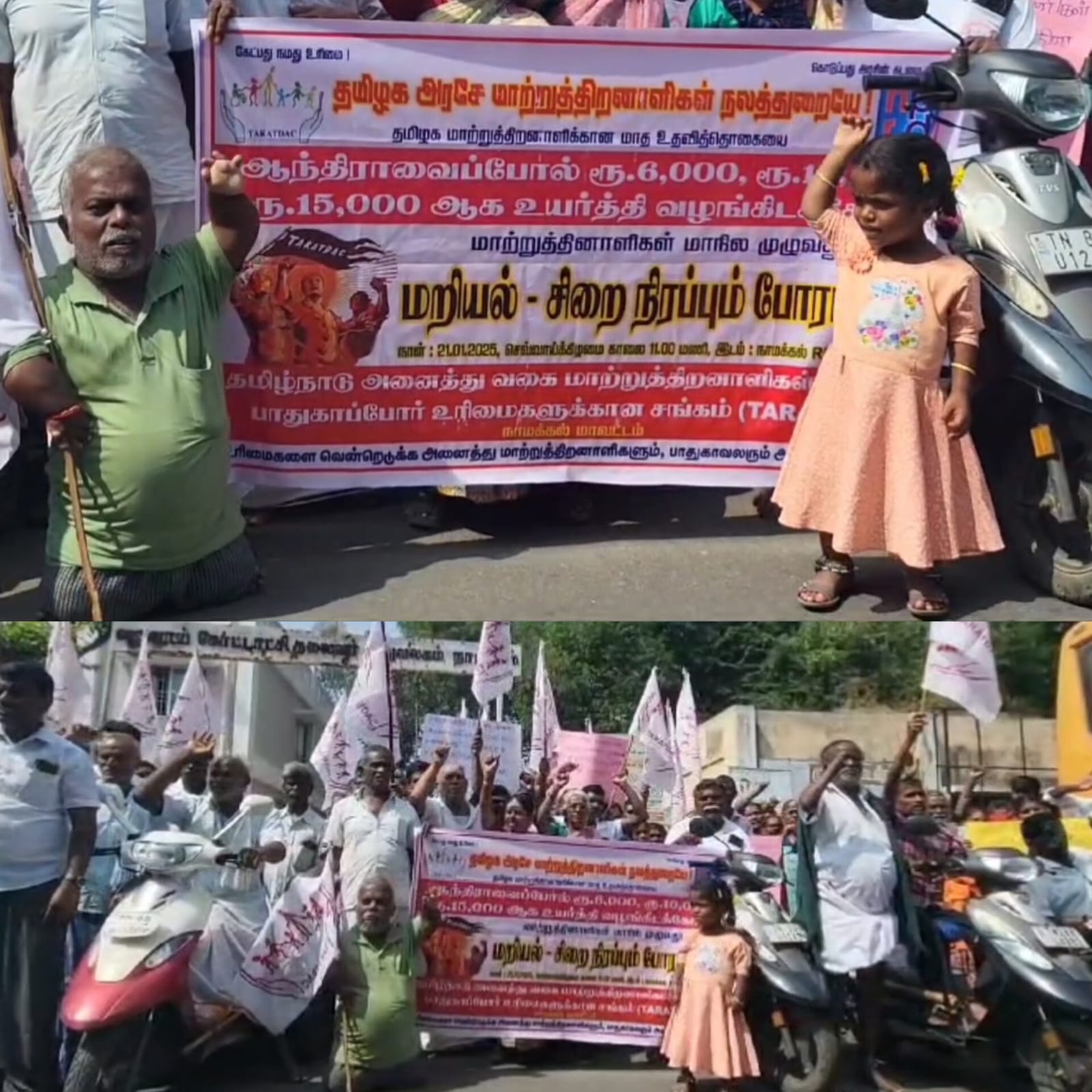 தமிழ்நாடு அனைத்து வகை மாற்றுத்திறனாளிகள் மற்றும் பாதுகாப்போர் உரிமைகளுக்கான சங்கத்தின் சார்பில் பல்வேறு கோரிக்கைகளை வலியுறுத்தி இன்று மாநிலம் முழுவதும் சிறை நிரப்பும் போராட்டம் நடைபெற்றது. அதே போல நாமக்கல் கோட்டாட்சியர் அலுவலகம் முன்பாக மாற்றுத்திறனாளிகள் 60- க்கும் மேற்பட்டோர் மறியல் போராட்டத்தில் ஈடுபட்டனர்..