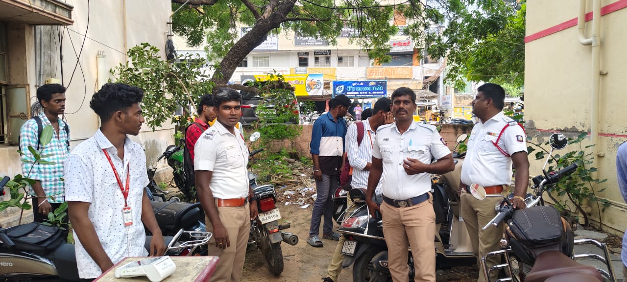 இந்த நிலையில் இன்று பாலை ரோட்டில் உள்ள தனியார் கல்லூரி முன்பு போக்குவரத்து உதவி ஆய்வாளர் சதீஷ் தலைமையில் போக்குவரத்து காவல்துறையினர் இருசக்கர வாகன சோதனையில் ஈடுபட்டனர்