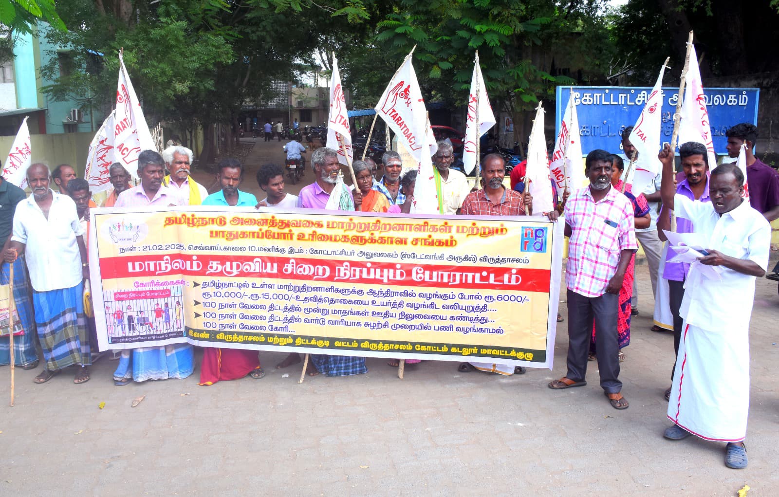 விருத்தாசலம் கோட்டாட்சியர் அலுவலகம் முன்பாக நடைபெற்ற இந்தப் போராட்டத்தில் மாநில குழு உறுப்பினர் ரவீந்திரன் தலைமை தாங்கினார் பொருளாளர் விமலா முன்னிலை வகித்தார்.