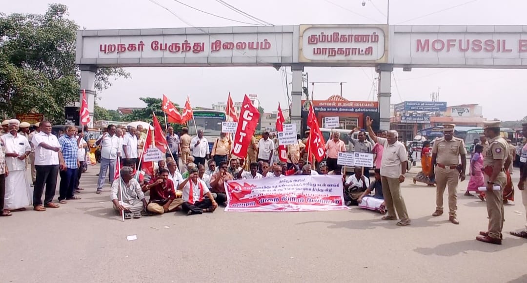 தஞ்சாவூர் மாவட்டம் கும்பகோணத்தில் புதிய பேருந்து நிலையம் முன்பு தமிழக அரசு போக்குவரத்துக் கழகத்தில் உள்ள போக்குவரத்து கழக தொழிலாளர்களின் ரூ.7500 கோடி கடனை வழங்கிட வலியுறுத்தி காரல் மார்க்ஸ் தலைமையில் சாலை மறியல் போராட்டத்தில் ஈடுபட்டனர்.