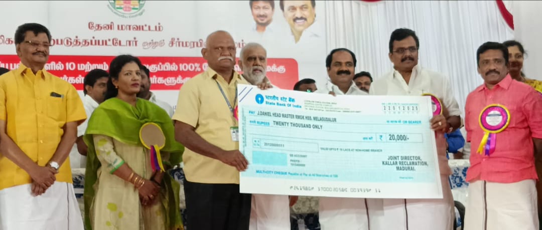 தேனி மாவட்டம் வட புதுப்பட்டி நாடார் சரஸ்வதி கலை மற்றும் அறிவியல் கல்லூரியில் அரசு விழாவில் கள்ளர் சீரமைப்பு பள்ளிகளில் அரசு பொதுத்தேர்வில் 10 மற்றும் 12 ஆம் வகுப்பில் 100 சதவீதம் தேர்ச்சி பெற்றமைக்கு தலைமை ஆசிரியர்கள் மற்றும் பள்ளி ஆசிரியர்களுக்கு பாராட்டு கேடயம் மற்றும் சான்றிதழ்களை வழங்கினார்கள் உடன் மிகவும் பிற்படுத்தப்பட்டோர் மற்றும் சீர் மரபினர் நலம் ஆணையர் வா சம்பத் மாவட்ட ஆட்சித் தலைவர் ஆர் வி ஷஜீவனா தேனி பாராளுமன்ற உறுப்பினர் தங்க தமிழ்ச்செல்வன் எம்பி சட்டமன்ற உறுப்பினர்கள் கம்பம் என் ராமகிருஷ்ணன் பெரியகுளம் கே எஸ் சரவணக்குமார் ஆண்டிபட்டி ஆ. மகாராஜன் தேனி நகராட்சி நகர் மன்ற தலைவர் ரேணுப் பிரியா பாலமுருகன் திட்டக்குழு உறுப்பினர் நாராயண பாண்டியன் உள்ளிட்ட பலர் உள்ளனர் இந்த நிகழ்ச்சிக்கான ஏற்பாடுகளை மாவட்ட செய்தி மக்கள் தொடர்பு துறை அலுவலர் இரா நல்லதம்பி வெகு சிறப்பாக செய்திருந்தார்