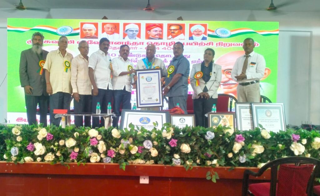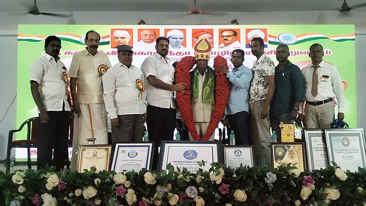 திருவண்ணாமலை மாவட்டம், வந்தவாசி அடுத்த தெள்ளார் சுவாமி விவேகானந்தா தொழிற்பயிற்சி நிலையத்தில் 40 ஆண்டுகள் தொடர்ந்து தேசிய கொடியை ஏற்றிய கலைமாமணி முனைவர் வி‌. முத்து அவர்களுக்கு இன்டர்நேஷனல் அச்சுவர்ஸ் யுனிவர்சல் புக் ஆஃப் ரெக்கார்ட்ஸ் உள்ளிட்ட 4 நிறுவனங்கள் உலக சாதனை சான்றிதழ் மற்றும் விருது வழங்கும் விழா இராஜா நந்திவர்மன் கலைக் கல்லூரியில் நடைபெற்றது.