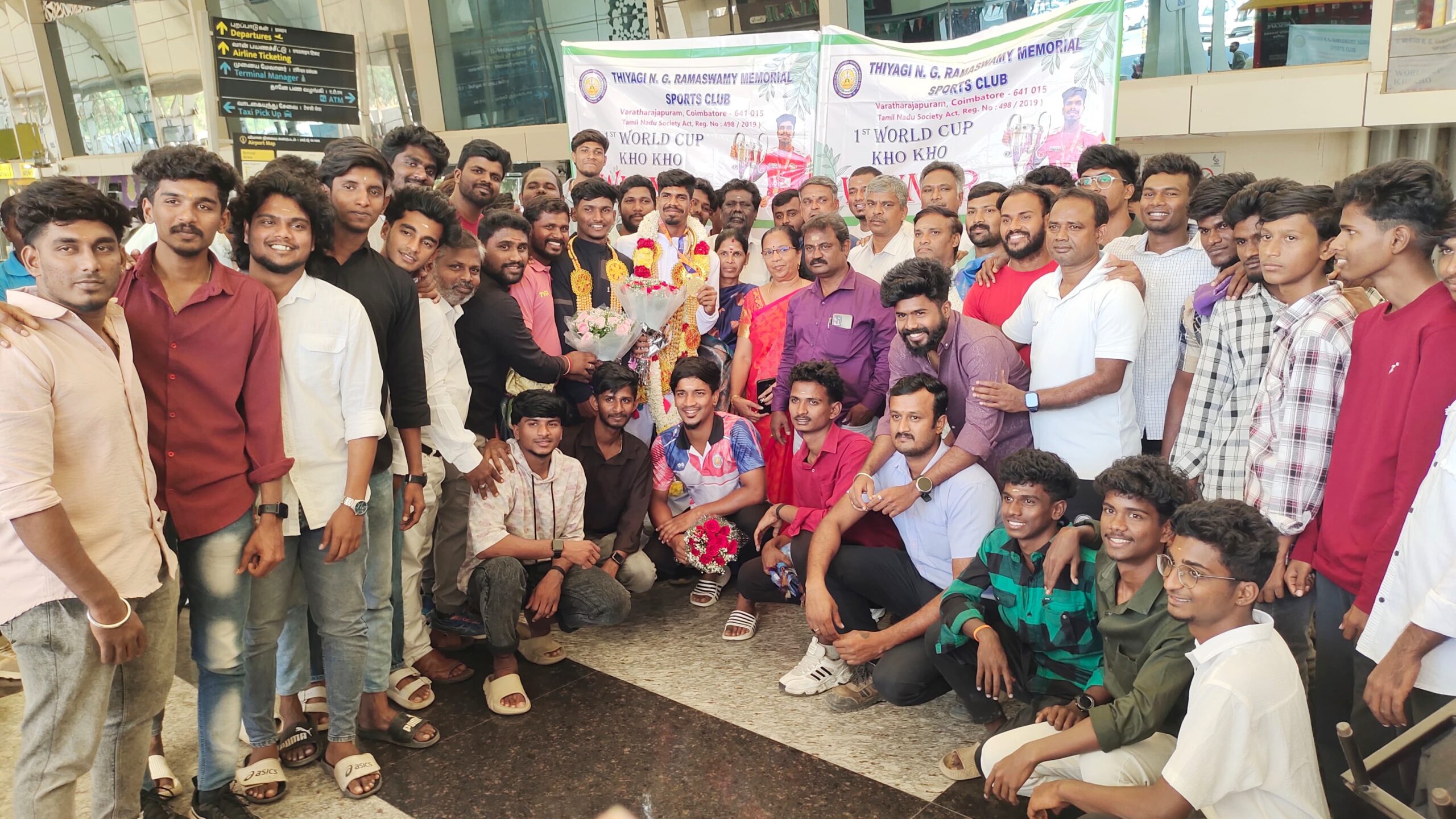 உலக கோப்பையை வென்ற கோ கோ இந்திய அணியில் இடம் பெற்ற கோவை வீர்ருக்கு உற்சாக வரவேற்பு