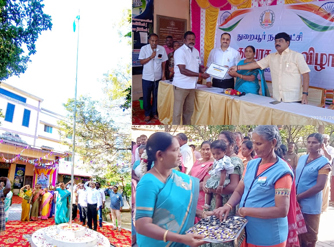 திருச்சி மாவட்டம் துறையூர் நகராட்சி அலுவலகத்தில் 76 வது குடியரசு தின விழா (ஜனவரி -26) கொண்டாடப்பட்டது.இதில் நகர் மன்ற தலைவர் செல்வராணி மலர் மன்னன் தேசிய கொடியேற்றி மரியாதை செலுத்தி இனிப்பு வழங்கினார்.விழாவில் துணைத் தலைவர் மெடிக்கல் ந. முரளி, ஆணையர் சுரேந்திர ஷா, ஆகியோர் முன்னிலை வகித்தனர். இந்நிகழ்ச்சியில் சிறப்பாக பணியாற்றிய தூய்மை காவலர்களுக்கு பாராட்டு சான்றிதழ்கள் வழங்கப்பட்டது.