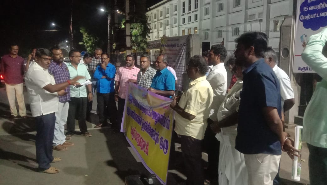 கரூர் மாநகராட்சி அலுவலகம் முன்பு தமிழ்நாடு மாநகராட்சி அலுவலர்கள் மற்றும் பணியாளர்கள் ஒருங்கிணைப்பு குழு சார்பில் மாநகராட்சி நகராட்சி சார்பில் வரி வசூல் செய்யும் பணியினை மேற்கொள்ளும் அரசு ஊழியர்களை மரியாதை குறைவாக நடத்துவதையும், ஆய்வு கூட்டம் என்ற பெயரில் பணியாளர்களை அச்சுறுத்தும் போக்கினை கைவிட வலியுறுத்தியும் கண்டன ஆர்ப்பாட்டம் மாநில ஒருங்கிணைப்பாளர் செந்தில் தலைமையில் நடைபெற்றது.