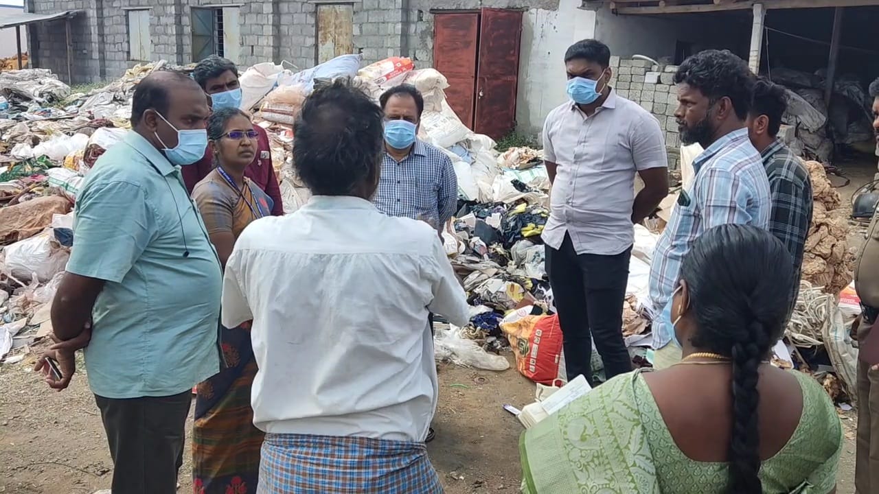 பல்லடம் அருகே மூட்டை மூட்டையாக கழிவுகள் பதுக்கி வைக்கப்பட்டிருந்த தோட்டத்து குடோனில் அரசு அதிகாரிகள் ஆய்வு…….