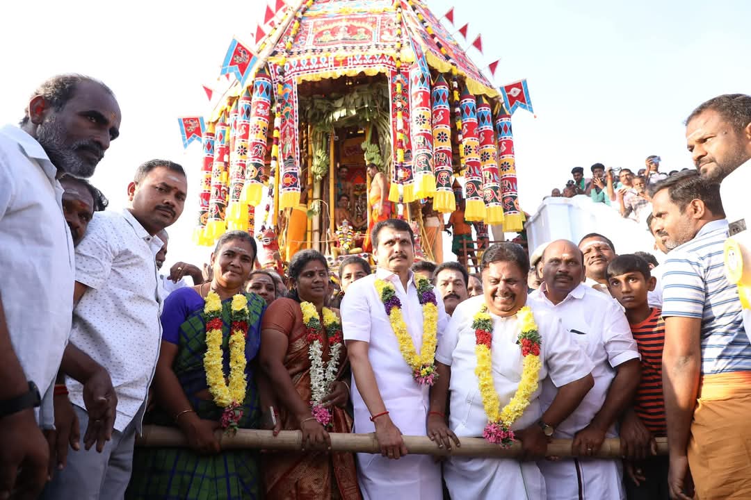 பின்னர் கோயிலில் முன்பு பொதுமக்களுடன் சேர்ந்து தேரை வடம் பிடித்து இழுத்து கோவிலை சுற்றி வந்தானர். இந்நிகழ்ச்சியில் ஏராளமான பக்த கோடிகள் கலந்து கொண்டு சாமி தரிசனம் செய்தனர். பின்னர் அமைச்சர் செந்தில் பாலாஜி பக்தகோடிகளுக்கு அன்னதானம் வழங்கினார். உடன் மேயர், துணை மேயர், மாமன்ற உறுப்பினர்கள் மற்றும் பலர் கலந்து கொண்டனர்.