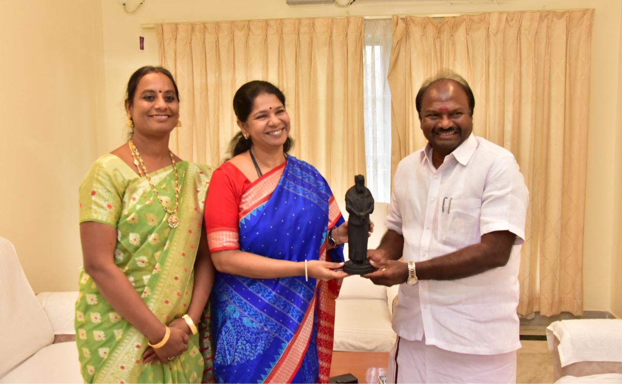 விழுப்புரத்தில் திமுக துணைப் பொதுச் செயலாளரும், நாடாளுமன்ற குழுத் தலைவருமான கனிமொழி கருணாநிதியை ஈரோடு கிழக்கு சட்டமன்றத் தொகுதி இடைத்தேர்தலில் வெற்றி பெற்று சட்டமன்ற உறுப்பினராக பதவியேற்றுக் கொண்ட வி.சி.சந்திரகுமார் நேரில் சந்தித்து தந்தை பெரியார் சிலையை வழங்கி வாழ்த்து பெற்றார். மேலும், வி.சி.சந்திரகுமாருக்கு சால்வை அணிவித்து கனிமொழி கருணாநிதி வாழ்த்து தெரிவித்தார்.
