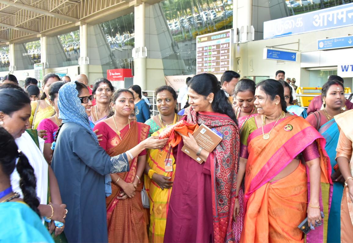மதுரை, திண்டுக்கல், தேனி, கரூர், ராமநாதபுரம், சிவகங்கை, விருதுநகர், திருநெல்வேலி, தூத்துக்குடி, தென்காசி மற்றும் கன்னியாகுமரி மாவட்டங்கள் உட்பட்ட மாநகராட்சி, நகராட்சி மற்றும் பேரூராட்சிகளில் செயல்படுத்திவரும் வளர்ச்சி திட்டப் பணிகள் குறித்த ஆய்வுக் கூட்டத்தில் கலந்து கொள்வதற்காக மதுரை விமானநிலையத்திற்கு வருகை புரிந்த திமுக துணைப் பொதுச் செயலாளரும், நாடாளுமன்ற குழுத் தலைவருமான கனிமொழி கருணாநிதிக்கு மதுரை மாவட்ட திமுக மகளிர் அணியை சார்ந்த நிர்வாகிகள் மற்றும் தொண்டர்கள் உற்சாக வரவேற்பு அளித்தனர்.