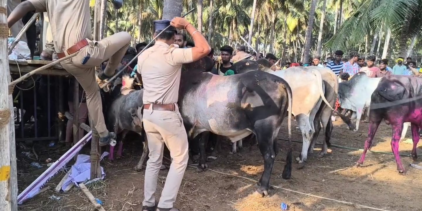 அழகுமலை ஜல்லிக்கட்டு முடிய இன்னும் அரை மணி நேரமே உள்ள நிலையில் மீதமுள்ள காளைகளை வாடிவாசலுக்குள் அனுமதிக்க கோரி காலை உரிமையாளர்கள் போலீசார் உடன் வாக்குவாதம்- உரிமையாளர்கள் மீது தடியடி…