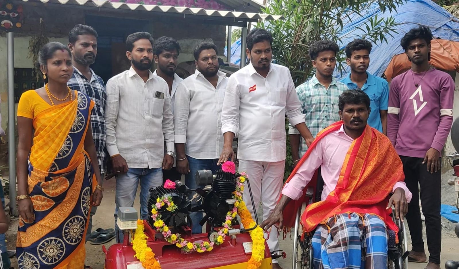 நடக்க முடியாத மாற்றுத்திறனாளியாக மாறி வாழ்வாதாரம் இழந்து குடும்பத்தினர் தவித்து வந்தனர். இதனை அறிந்த தமிழக வெற்றி கழக மாவட்ட செயலாளர் குட்டி கோபி அறிவுறுத்தலின் பேரில் செம்பனார் கோயில் ஒன்றிய நிர்வாகி மணிகண்டன், குன்னம் விக்கி ஏற்பாட்டில் 17500 ரூபாய் மதிப்பீட்டில் மாவீரன் தொழில் செய்வதற்கு ஏதுவாக பெயிண்டிங் கம்பர்சர் கொடையாக வழங்கப்பட்டது.
