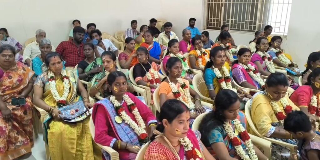 சமூக நலன் மற்றும் மகளிர் உரிமை துறை சார்பில் ஒருங்கிணைந்த குழந்தைகள் வளர்ச்சி பணிகள் திட்டத்தின் கீழ் திருப்பூர் மாவட்டம் பல்லடம் அடுத்த சாமலாபுரம் பேரூராட்சிக்குட்பட்ட பல்ல பாளையம் பகுதியிலுள்ள மண்டபத்தில் 110 பெண்களுக்கு சமுதாய வளைகாப்பு நிகழ்ச்சி நடைபெற்றது.