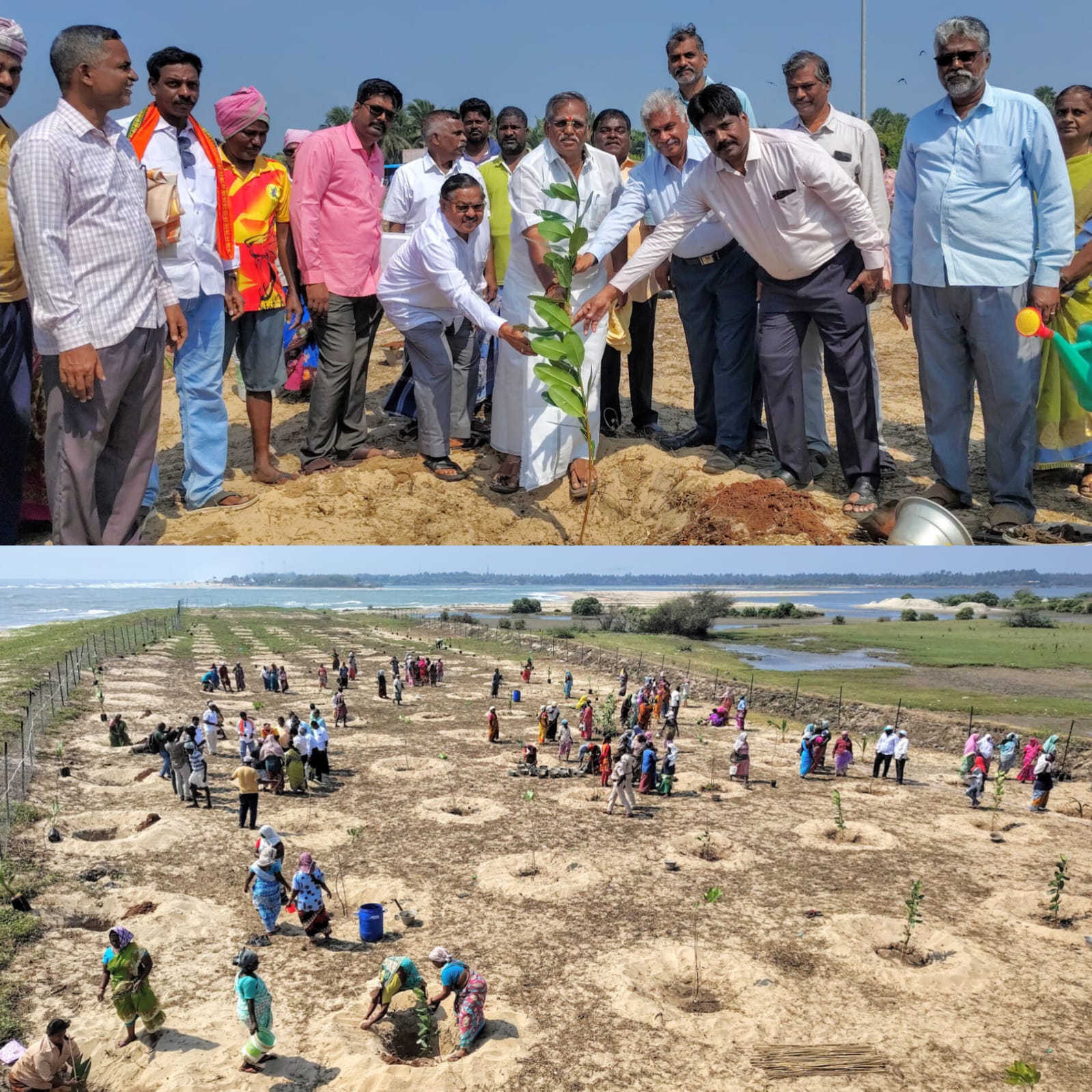 இதன் ஒரு பகுதியாக மணல் குன்றுகளை பசுமையாக்கும் திட்டத்தின் கீழ் கனகச்செட்டிக்குளம் முதல் மூர்த்திகுப்பம் கடலோரப்பகுதிகளில் உள்ள 226.35 ஏக்கர் பரப்பளவில் உள்ள மணல் குன்றுகளில் மகாத்மா காந்தி தேசிய ஊரக வேலை உறுதித் திட்டத்தின் கீழ் 5000- மரக்கன்றுகளை நடவு செய்ய முடிவு செய்யப்பட்டு அதற்கான துவக்க நிகழ்வு சின்ன வீராம்பட்டினம் கடற்கரையில் இன்று நடைபெற்றது.