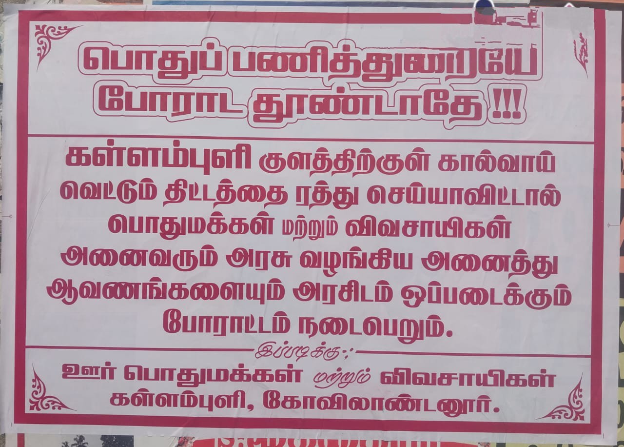 தென்காசி மாவட்டம் கடையநல்லூர் வட்டம் கருப்பாநதி அணையிலிருந்து பாப்பான் கால்வாய் வழியாக 13.ஆம் நம்பர் மடையில் இருந்து தண்ணீர் வரும் கள்ளம்புளி குளத்திற்கு நடுவே கால்வாய் வெட்டும் திட்டத்தை ரத்து செய் இல்லையேல் அரசு கொடுத்த ஆவணங்கள் அனைத்தையும் அரசிடம் ஒப்படைக்கும் போராட்டங்கள் நடைபெறும் என்று பொதுமக்கள் விவசாயிகள் சார்பில் ஒட்டப்பட்ட போஸ்டரால் பரபரப்பு ஏற்பட்டது