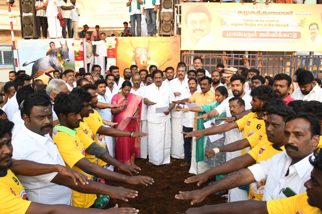 மதுரை மாவட்டம் அலங்காநல்லுார் அருகே கீழக்கரை கிராமத்தில் அமைந்துள்ள கலைஞர் நூற்றாண்டு ஏறுதழுவுதல் அரங்கத்தில் மதுரை மேற்கு சட்டமன்ற தொகுதி சார்பில் பிரமாண்ட ஜல்லிக்கட்டு போட்டி நடைபெற்றது.