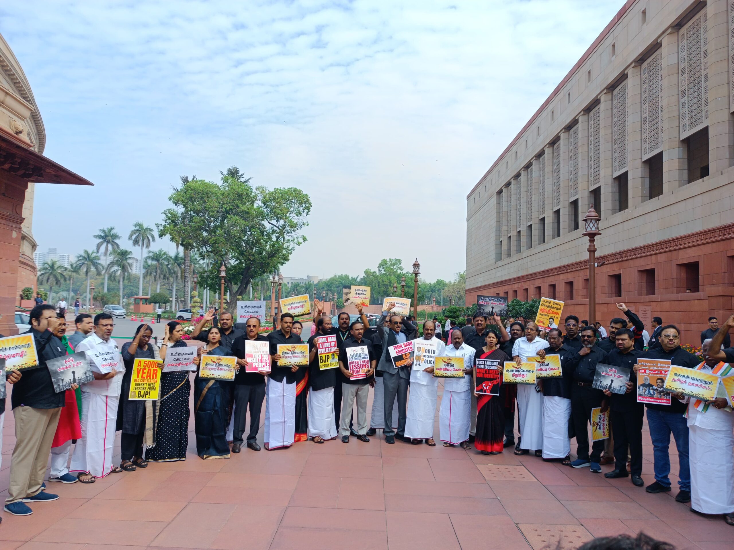 தமிழ்நாடு முதலமைச்சர் மு.க.ஸ்டாலின் அறிவுறுத்தலின்படி, மும்மொழி கொள்கையை தினிப்பதை கண்டித்து எதிர்ப்பு தெரிவிக்கும் வகையில் ஒன்றிய அரசை கண்டித்து திமுக எம்.பி.க்கள் மற்றும் தமிழ்நாடு கூட்டணிக் கட்சி எம்.பி.க்கள் நாடாளுமன்ற முகப்பில் போராட்டம் நடத்தினர்.