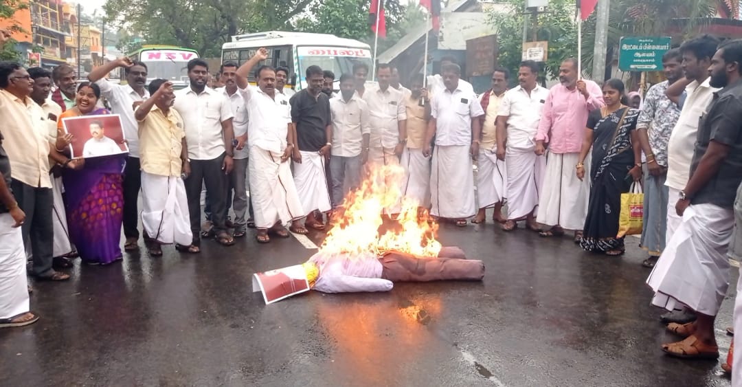 அந்த வகையில் பாபநாசம் அண்ணா சிலை அருகில் தெற்கு ஒன்றிய செயலாளர் நாசர் தலைமையில் ஏராளமானோர் கலந்துகொண்டு அவரது உருவ பொம்மையை எரித்து கண்டன முழக்கமிட்டு ஆர்ப்பாட்டத்தில் ஈடுபட்டனர்.