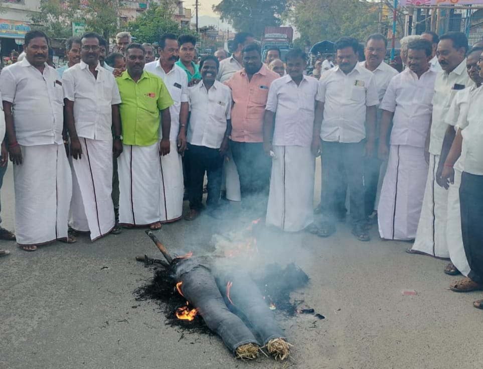 திருச்சி மாவட்டம் துறையூர் வட்டம் உப்பிலியபுரம் திமுக சார்பில் ஒன்றிய செயலாளர் முத்துசெல்வன் தலைமையில் உப்பிலியபுரம் பேருந்து நிலையம் முன்பு தமிழக எம்பிகளை நாகரீகமற்றவர்கள் என்று அவமரியாதையாக பேசிய ஒன்றிய கல்வி அமைச்சர் தர்மேந்திர பிரதானின் உருவ பொம்மையை எரித்து ஆர்ப்பாட்டத்தில் ஈடுபட்டனர்.