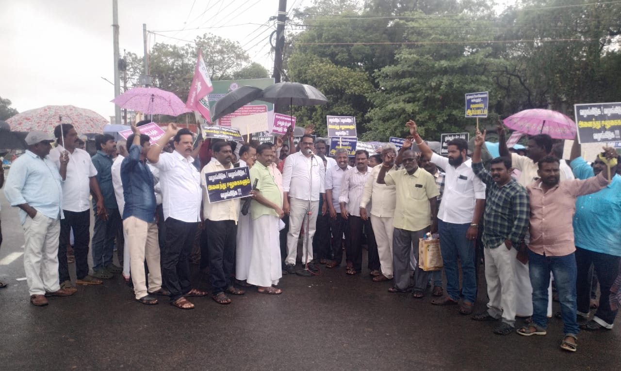தஞ்சாவூர் பனகல் கட்டிடம் எதிரே தமிழ்நாடு ஊராட்சி செயலாளர்கள் சங்க கொட்டும் மழையில் கோரிக்கை வலியுறுத்தி ஆர்ப்பாட்டம்.