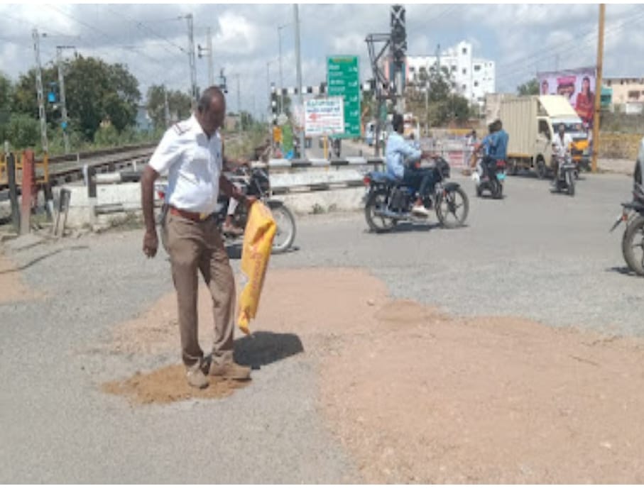தூத்துக்குடி 4ம் கேட் சாலையில் ஏற்பட்ட பள்ளத்தில் வாகன ஓட்டிகள் சிக்கி விபத்து ஏற்படா வண்ணம் தடுக்கும் பொருட்டு, நேற்று (15.03.2025) அங்கு போக்குவரத்து பாதுகாப்பு பணியில் ஈடுபட்டிருந்த மத்தியபாகம் போக்குவரத்து பிரிவு சிறப்பு சார்பு ஆய்வாளர் திரு. வள்ளிநாயகம் அப்பகுதியில் இருந்த மணலை மூடையில் அள்ளி பள்ளத்தில் கொட்டி சரி செய்தார்.
