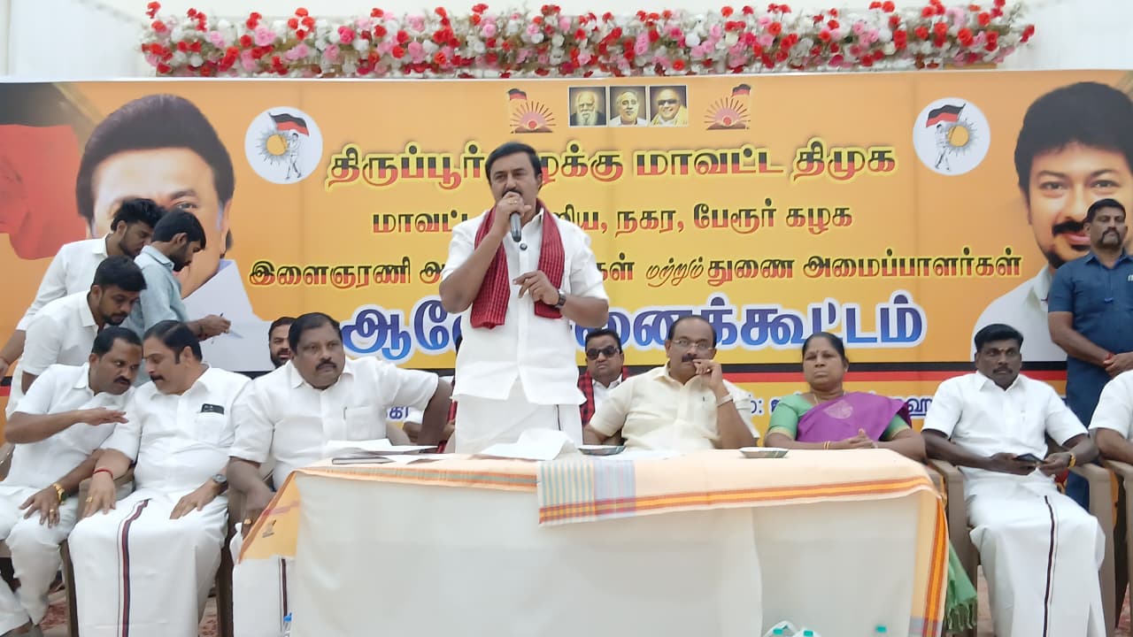 திருப்பூர் கிழக்கு மாவட்ட தி.மு.க சார்பாக மாவட்ட நகர ஒன்றிய பேரூர் கழக இளைஞரணி அமைப்பாளர்கள் மற்றும் துணை அமைப்பாளர்களுக்கான ஆலோசனைக் கூட்டம் தாராபுரம் தனியார் திருமண மண்டபத்தில் அமைச்சர். மு.பெ .சாமிநாதன் அவர்கள் (செய்தித்துறை மற்றும் தமிழ்வளர்ச்சித்துறை அமைச்சர்,கழக துணை பொதுச் செயலாளர்) அர. சக்கரபாணி அவர்கள், (உணவு மற்றும் உணவு பொருள்கள் வளங்கள் துறை அமைச்சர் மற்றும் கயல்விழி செல்வராஜ் அவர்கள், (மனிதவள மேலாண்மைத்துறை அமைச்சர் அவர்கள்), திருப்பூர் கிழக்கு மாவட்டச் செயலாளர், திருப்பூர் நான்காம் மண்டல தலைவர், மரியாதைக்குரிய