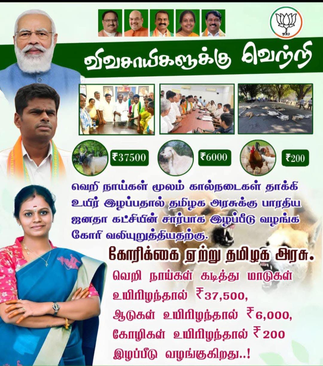 கடந்த ஒரு வருடத்திற்கு மேலாக திருப்பூர், ஈரோடு, நாமக்கல் மற்றும் கரூர் மாவட்டத்திற்கு உட்பட்ட பல கிராமங்களில் கால்நடை வளர்ப்போர் தங்களின் தோட்டங்களில் வளர்க்கும் கால்நடைகள் தெருநாய்களால் தொடர் உயிரிழப்புக்கு உள்ளாகி வந்த நிலையில் அரசு உரிய இழப்பீடு வழங்க வேண்டும் என பல்வேறு போராட்டங்களை நடத்தினர். இந்த நிலையில் நேற்று சட்டசபையில் இறந்த கால்நடைகளுக்கு இழப்பீடு வழங்கப்படும் என அறிவித்தனர்.