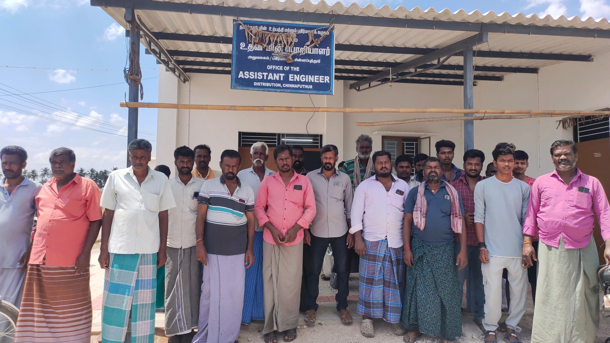நாங்கள் கடந்த 23- நாட்களாக முன்முனை இலவச மின்சாரம் இன்றி தவித்து வருகிறோம். மின்மாற்றி பழுதாகியும் அதை பலமுறை அதிகாரிகளிடம் எடுத்துக் கூறியும் எந்தவித நடவடிக்கையும் எடுக்கவில்லை குறைந்த மின்னழுத்தத்தை எங்களுக்கு வழங்குவதால் மின்மோட்டார்கள் சில நேரங்களில் பழுதடைந்து விடுகின்றன. இதனால் டீசல் இன்ஜின் மூலம் தண்ணீர் பாய்ச்சும் பொழுது நாளொன்றுக்கு டீசல் செலவு 5000 ரூபாய் செலவு ஏற்படுகிறது மேலும் சரியான மின்சாரம் வழங்கப்படாத காரணத்தினால் கோழி ஆடு மாடுகளுக்கு தண்ணீர் இன்றி தவித்து வருகின்றன