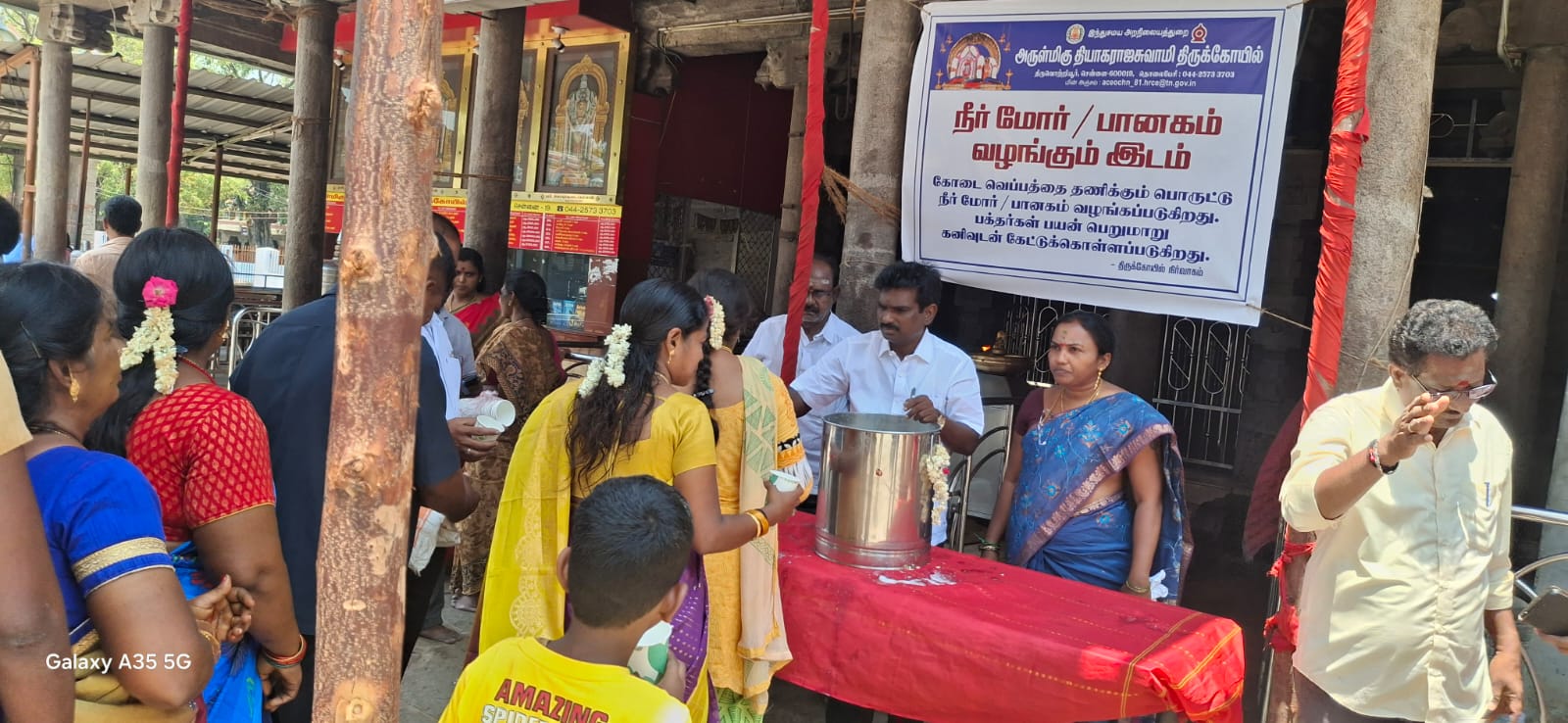 வெயிலின் தாக்கத்தை சமாளிக்க திருக்கோயில் வளாகத்தில் கேன்களில் தண்ணீர் வைத்தும் பக்தர்களுக்கு நீர்மோர் வழங்கப்பட்டது .