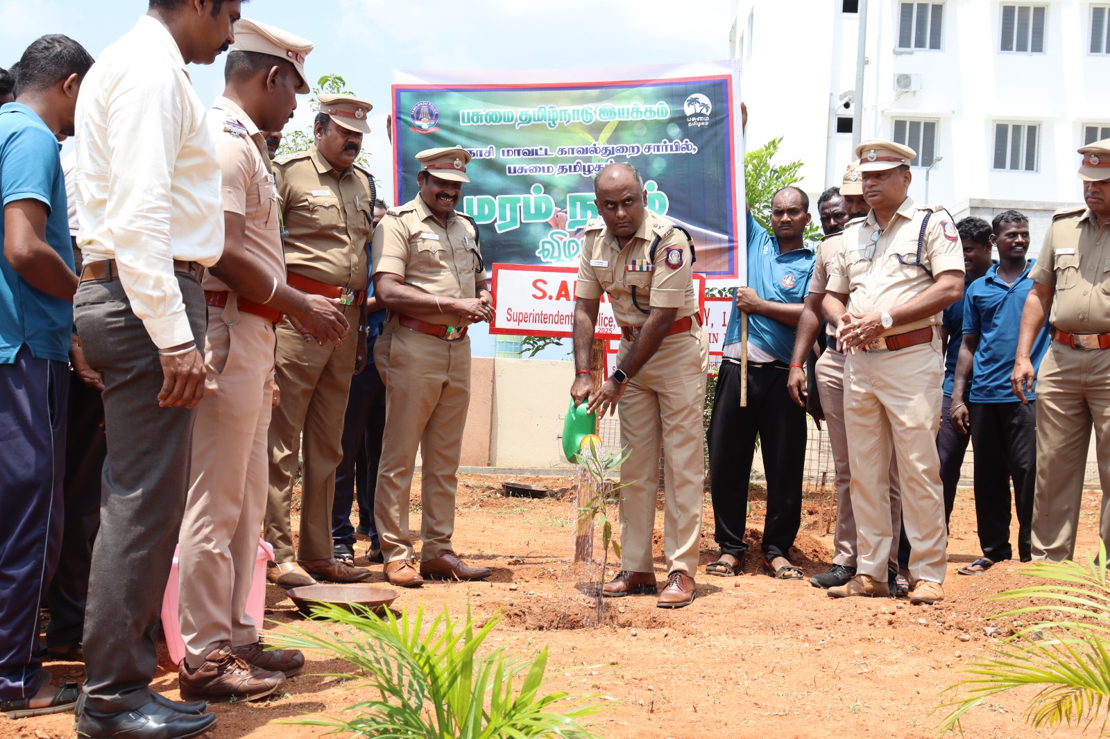 தென்காசி மாவட்ட காவல்துறை மற்றும் பசுமை தமிழ்நாடு இயக்கம் சார்பாக இயற்கை வளங்களை பாதுகாக்கும் விதமாகவும், மரம் நடுவதை ஊக்குவிக்கும் விதமாகவும் இன்று மாவட்ட காவல் கண்காணிப்பாளர் அரவிந்த் தலைமையில் மாவட்ட காவல் அலுவலகத்தில் பணிபுரியும் காவல் துறையினர்