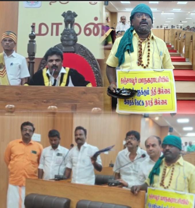 தஞ்சாவூர் மாநகராட்சி மாமன்ற கூட்டத்திற்கு பிச்சைக்காரர் போல வேடம் அணிந்து வந்த 20-வது வார்டு அதிமுக மாமன்ற உறுப்பினரால் பரபரப்பு.