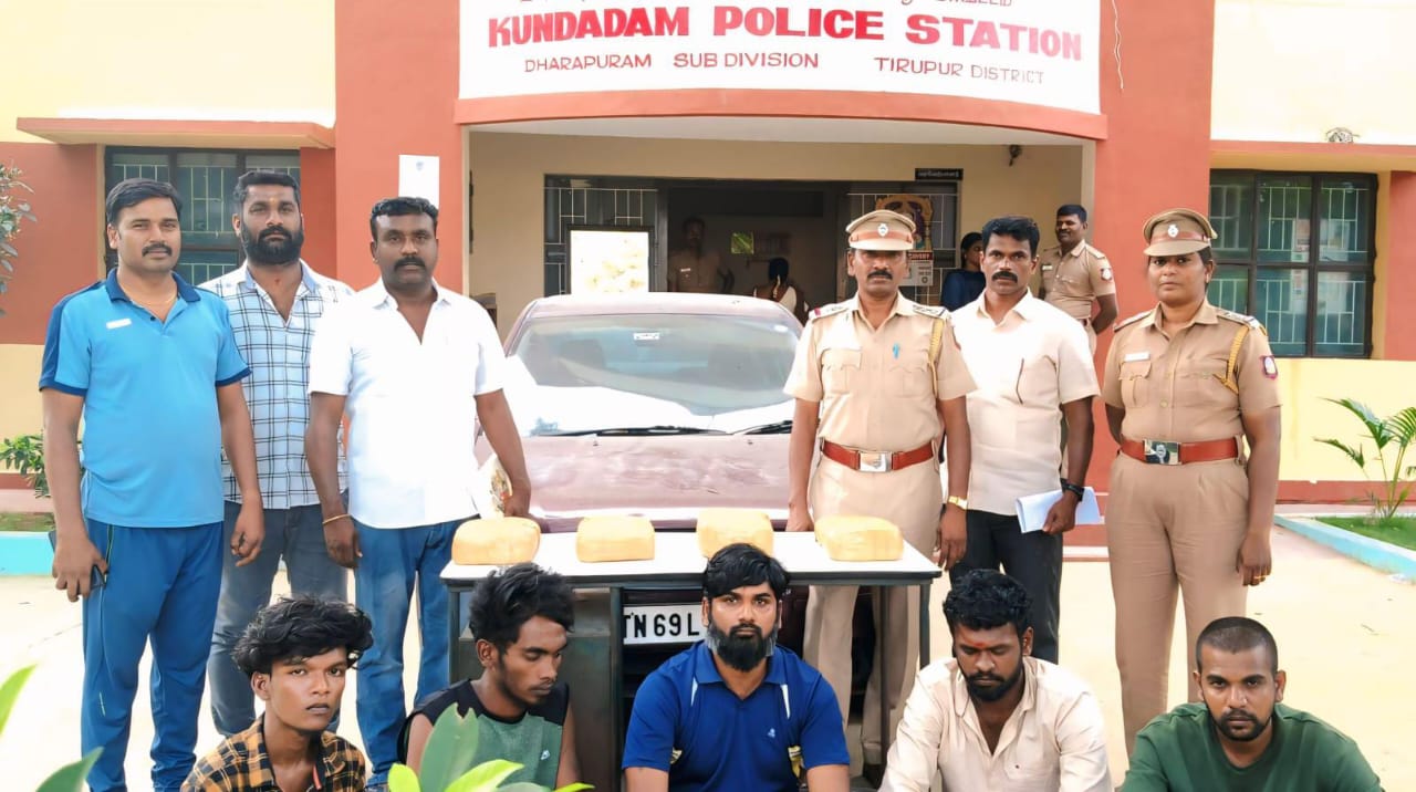 வாணியம்பாடி மோகன் மகன் பாஸ்கரன்.36 திருப்பத்தூர் மந்திரம் மகன் சுந்தர் வயது 24. சேதி நல்லூர் தூத்துக்குடி ராஜா மகன் புவனேஷ்வரன் வயது 26 தேனி பெரியகுளம் பொன்னையா மகன் சச்சின் வயது 20 தேனி பெரியகுளம் திருமலை தம்பி மகன் முருகேஷ் வயது 30 ஆகிய ஐந்து பேர் என்பது தெரியவந்தது. இது தொடர்பாக குண்டடம் போலீசார்.Ford Fiesta TN 69 L 0651 என்ற சொகுசு காரையும் மறைத்து வைத்திருந்த எட்டு கிலோ கஞ்சாவையும் பறிமுதல் செய்தனர்