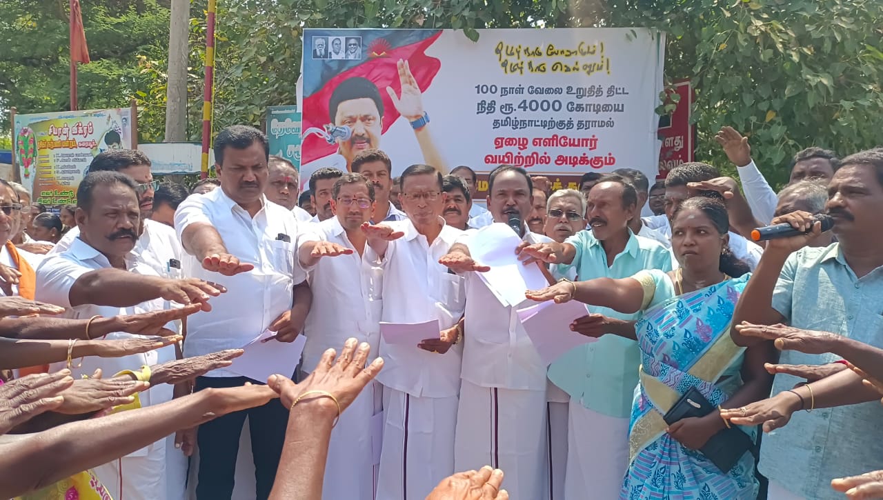 திருப்பூர் மாவட்டம் தாராபுரத்தை அடுத்துள்ள மூலனூர் ஊராட்சி பகுதிகளைச் சேர்ந்த 1000-மேற்பட்ட பெண்கள் கரையூர் பேருந்து நிறுத்தம் முன்பு மூலனூர் மேற்கு ஒன்றிய திமுக சார்பில் ஒன்றிய செயலாளர் துரை தமிழரசு தலைமையில் 100நாள் வேலை உறுதி திட்ட நிதி 4000-கோடியை வழங்க மறுக்கும் மத்திய அரசை கண்டித்து 1000-க்கும் மேற்பட்டோர் கண்டன முழக்கங்களை எழுப்பி ஆர்ப்பாட்டம் நடத்தி வருகின்றனர்.