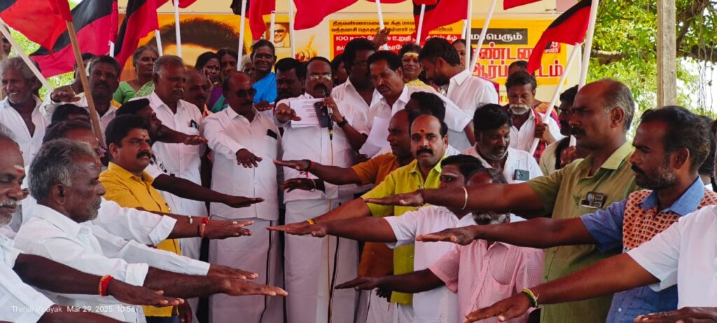 திருவண்ணாமலை மாவட்டம், வந்தவாசி அடுத்த தெள்ளார் மத்திய ஒன்றியச் செயலாளர் டி.டி.ராதா தலைமையிலும், முன்னாள் எம்எல்ஏ கவிஞர் கோ.எதிரொலிமணியன் தலைமையிலும், சி.ம.புதூர் மற்றும் தென்தின்னலூர் ஆகிய இடங்களில் மகாத்மா காந்தி தேசிய ஊரக வேலைவாய்ப்பு 100 நாள் உறுதித்திட்ட நிதி ரூ.4000 கோடியை தமிழ்நாட்டிற்கு தராமல் வஞ்சிக்கும் மத்திய அரசை கண்டித்து முழக்கங்கள் எழுப்பி உறுதிமொழி ஏற்க்கப்பட்டது. கூட்டத்தில் மாவட்ட, ஒன்றிய, பேரூர் மற்றும் கிளை கழக நிர்வாகிகள் மற்றும் இளைஞரணி நிர்வாகிகள் மற்றும் திரளான மகளிர் பெருமக்கள் கலந்து கொண்டு மத்திய அரசை கண்டித்து கண்டன முழக்கமிட்டனர்.