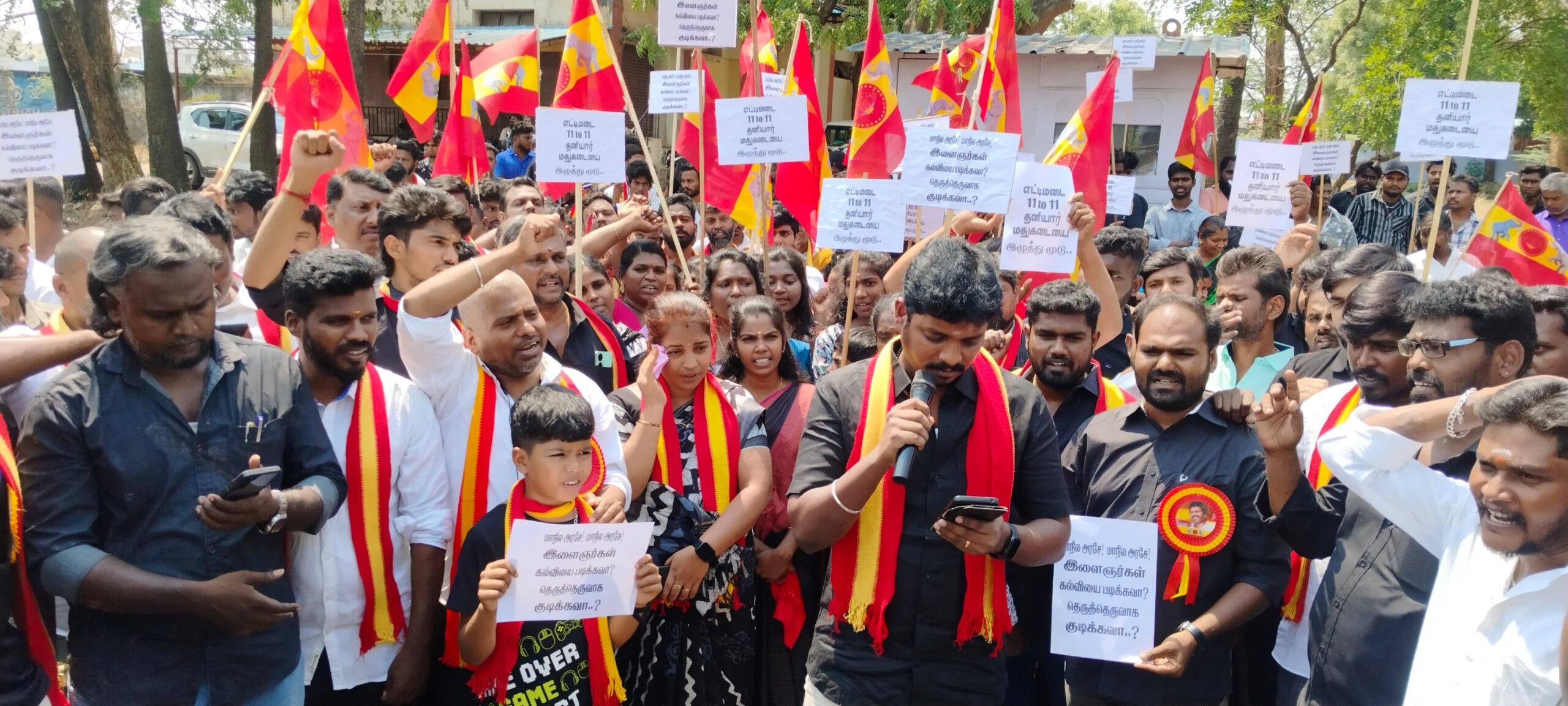 க.க.சாவடி சந்திப்பு அருகே நடைபெற்ற ஆர்ப்பாட்டத்தில் சுமார் 300க்கும் மேற்பட்டோர் கருப்பு சட்டை அணிந்து கலந்துகொண்டு டாஸ்மாக் மற்றும் திமுக அரசுக்கு எதிராக கண்டன கோஷங்களை எழுப்பினர்.