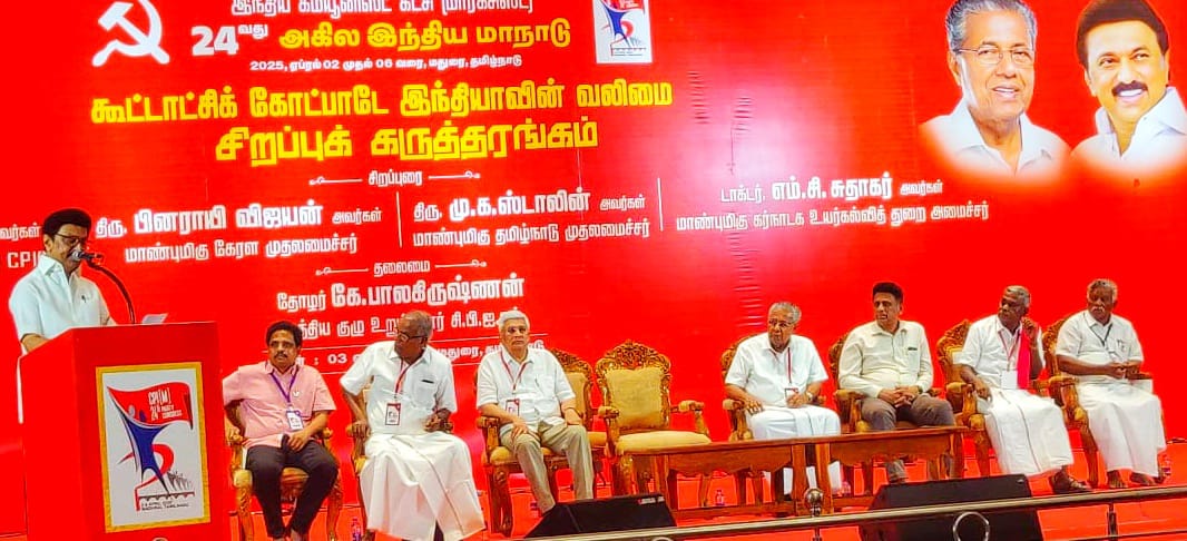 மதுரையில் துவங்கி இரண்டாவது நாளாக நடை பெற்று வரும் மார்க்சிஸ்ட் கம்யூனிஸ்ட் கட்சியின் அகில இந் திய மாநாட்டில் மாநில உரிமைகள் பாது காப்பு கருத்தரங்கில் தமிழக முதல்வர் மு.க. ஸ்டாலின் பங்கேற்றார்.
