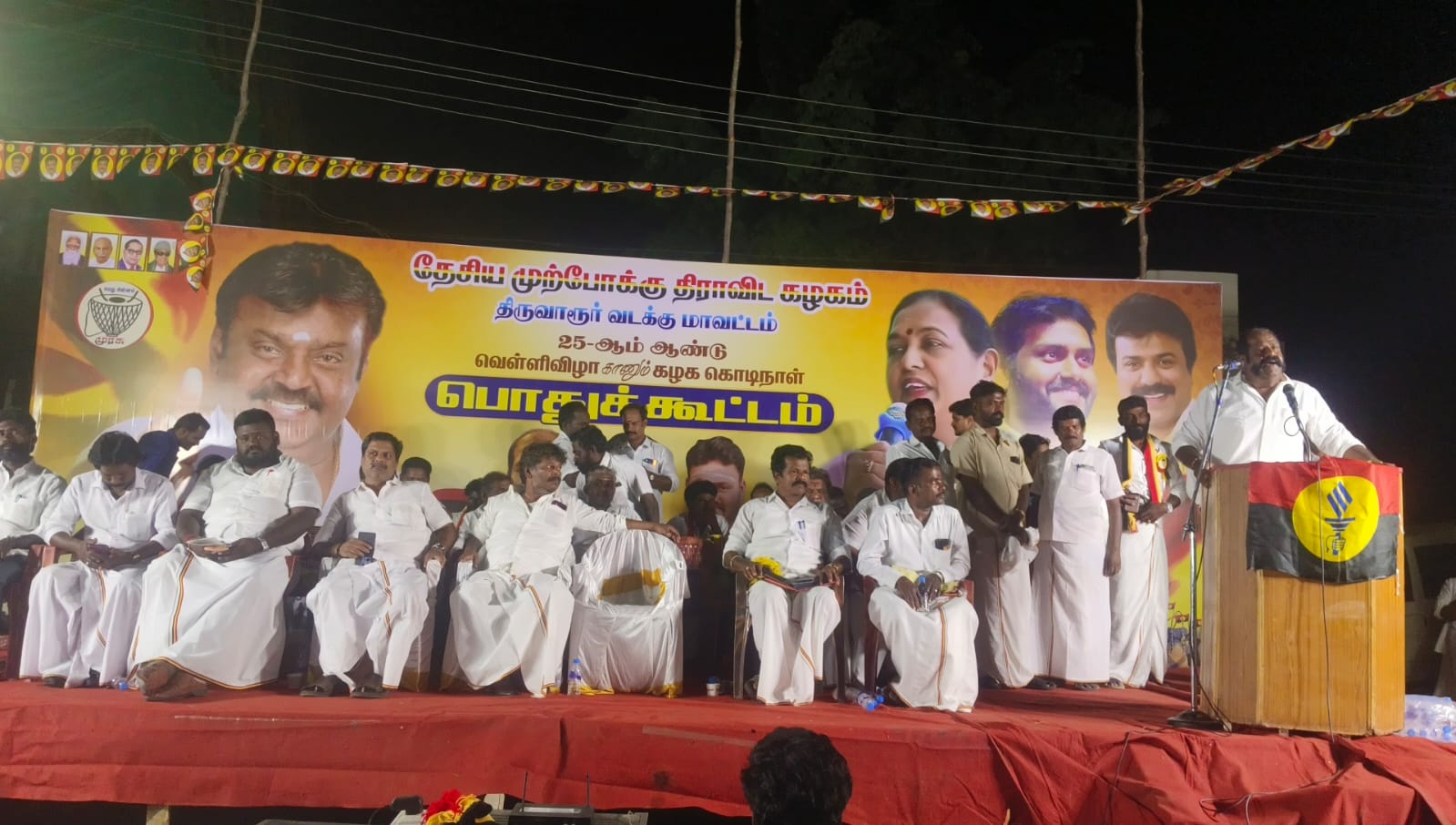 தேசிய முற்போக்கு திராவிட கழகத்தின் 25 ஆம் ஆண்டு கழகக் கொடி நாள் வெள்ளி விழா பொதுக்கூட்டம் திருவாரூர் மாவட்டம் குடவாசல் கடை வீதியில் தேமுதிக திருவாரூர் வடக்கு மாவட்ட கழக செயலாளர் சண்முகராஜ் தலைமையில் நடைபெற்றது குடவாசல் பேரூர் செயலாளர் மாரிமுத்து வரவேற்புரை ஆற்றினார்..