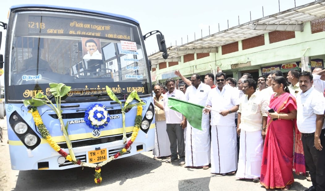 தேனி அல்லிநகரம் நகராட்சி கர்னல் ஜான் பென்னிகுவிக் பேருந்து நிலையத்தில் ஞாயிற்றுக்கிழமை தமிழ்நாடு அரசு போக்குவரத்து கழகம் சார்பில் தேனி பாராளுமன்ற உறுப்பினர் தங்க தமிழ்ச்செல்வன் எம்பி பெரியகுளம் சட்டமன்ற உறுப்பினர் கே எஸ் சரவணக்குமார் மாவட்ட வருவாய் அலுவலர் ஜ. மகாலட்சுமி ஆகியோர் முன்னிலையில் புதிய 7 நகரப் பேருந்துகளை கொடியசைத்து பொதுமக்கள் பயன்பாட்டிற்கு துவக்கி வைத்தனர்