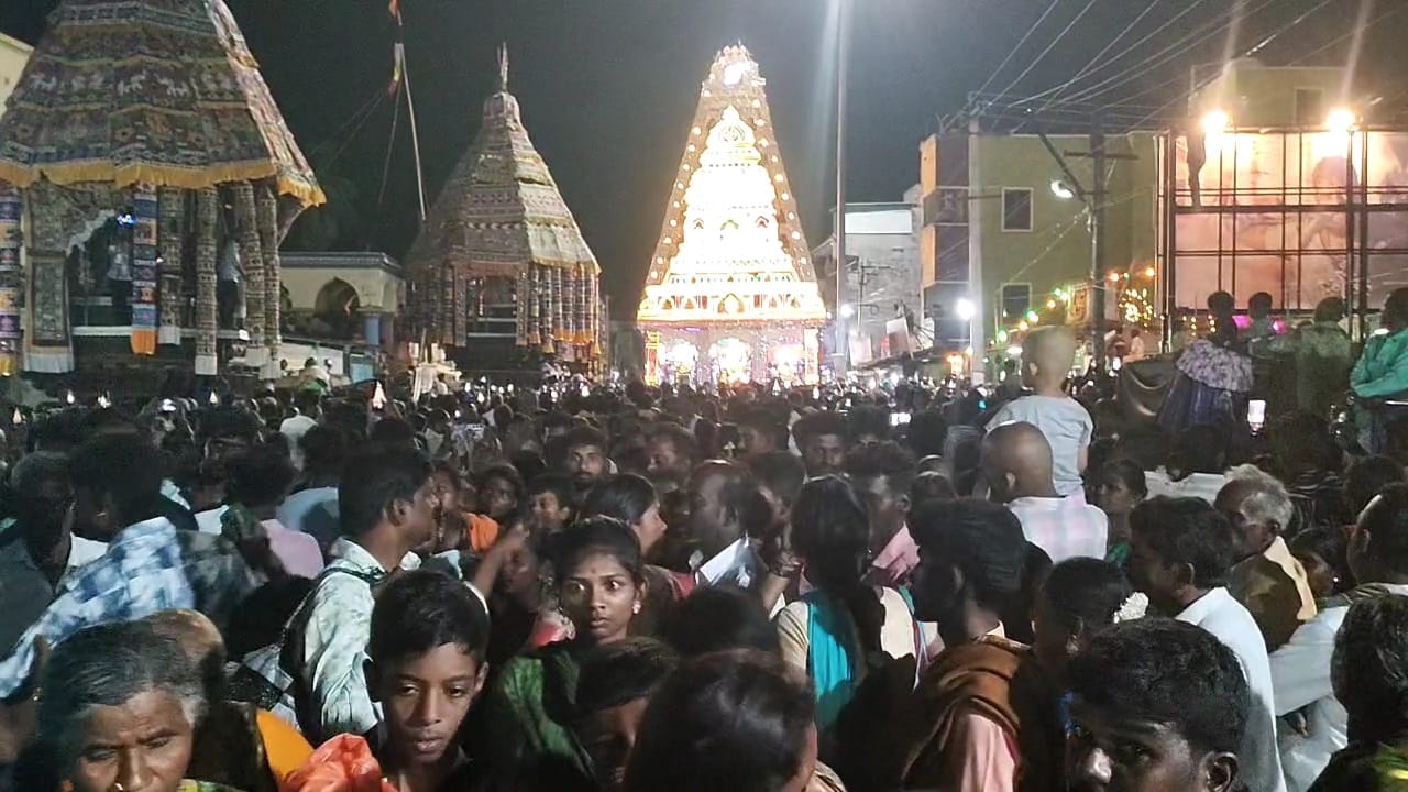 சந்நிதியிலிருந்து பஞ்சமூர்த்திகள் சகோபுரத்தில் எழுந்தருள மகாதீபாராதனை உடன் வீதியுலா துவங்கியது. பல்லாயிரக்கணக்கான பக்தர்கள் சகோபுபரத்தை வடம் பிடித்து இழுத்தனர்.உள்ளூர்,வெளியூர் பக்தர்கள் மற்றும் குலதெய்வ வழிபாட்டினர் உட்பட பல்லாயிரக்கணக்கானோர் வடம் பிடித்திழுத்து வழிபட்டனர்.