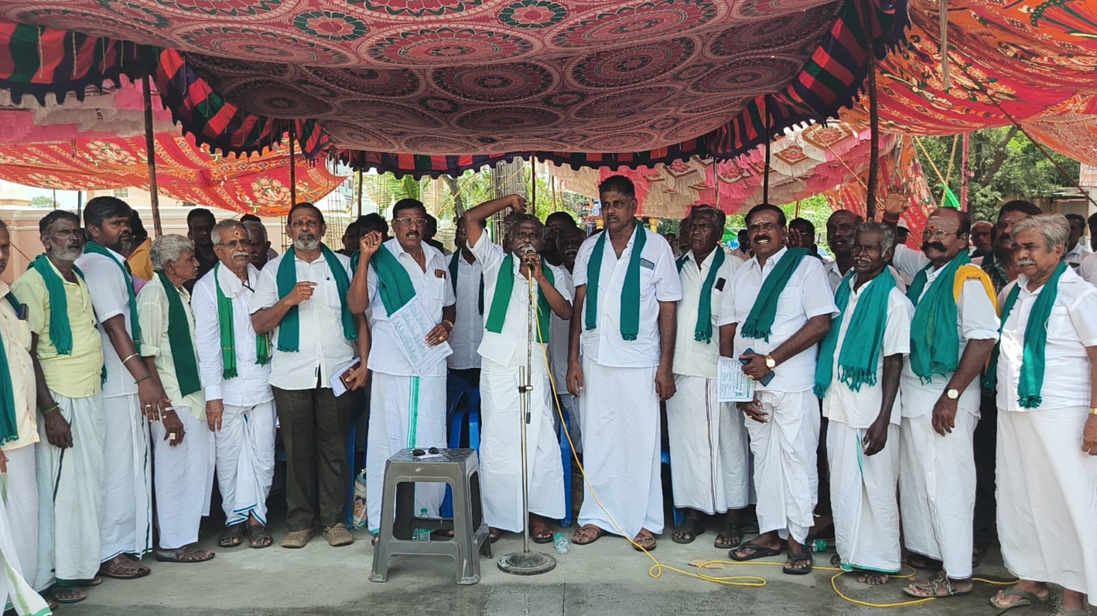 கோவில் மற்றும் ஆதீனத்துக்கு சொந்தமான விவசாய நிலங்கள் கார்ப்பரேட் நிறுவனங்களுக்கு விற்பனை செய்வதை அரசு கொள்கை ரீதியாக தடுத்து நிறுத்த வேண்டும் என்பது உள்ளிட்ட 12 அம்ச கோரிக்கைகளை வலியுறுத்தி பி.ஆர்.பாண்டியன் தலைமையில் 200க்கும் மேற்பட்ட விவசாயிகள் மாவட்ட ஆட்சியர் அலுவலகம் அருகே உண்ணாவிரத போராட்டத்தில் ஈடுபட்டுள்ளனர். மேலும் தங்களது கோரிக்கைகளை வலியுறுத்தி மத்திய மாநில அரசுகளுக்கு எதிராக கண்டன கோஷங்களை எழுப்பி உண்ணாவிரத போராட்டத்தை தொடர்கின்றனர்.