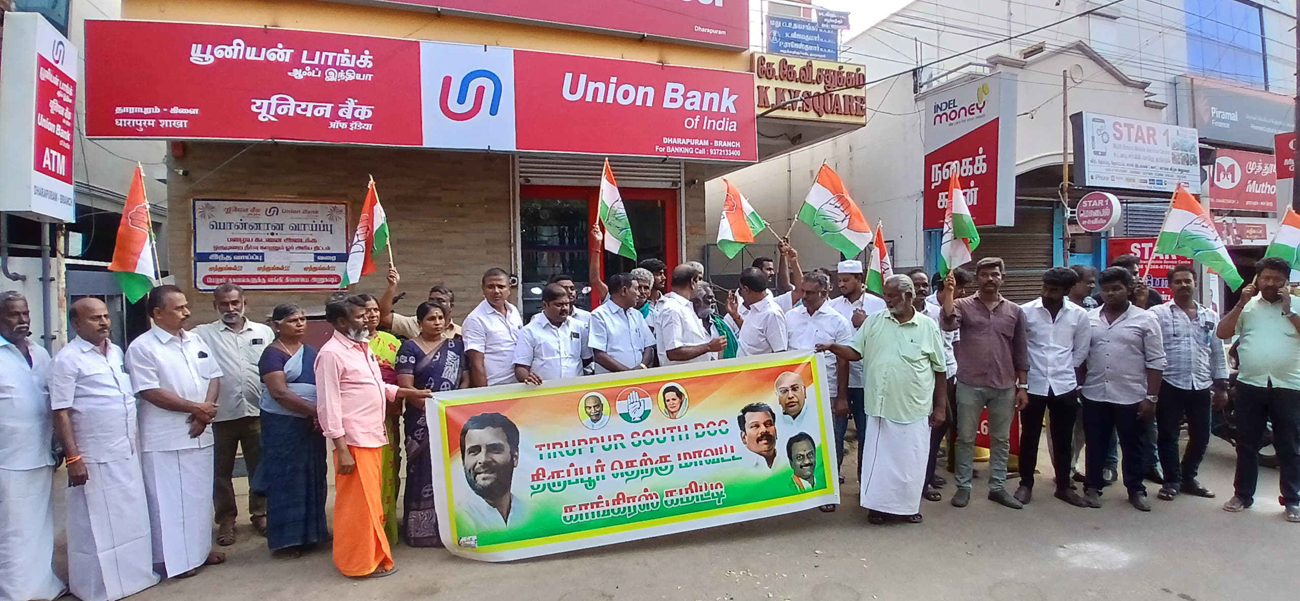 தாராபுரம்;சோனியா காந்தி, ராகுல் காந்தி மீது குற்றப்பத்திரிகை; திருப்பூர் தெற்கு மாவட்ட காங்கிரஸ் யூனியன் பேங்க் முன்பு மத்திய அரசை கண்டித்து கண்டன ஆர்ப்பாட்டம்!