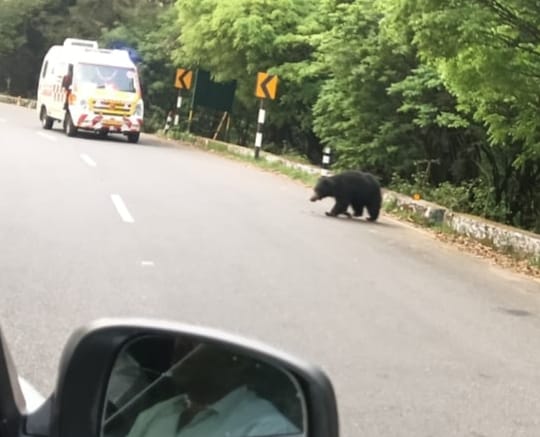 கோவை மாவட்டம் வால்பாறை சுற்று வட்டாரப் பகுதிகளில் வனவிலங்குகளின் நடமாட்டம் பகல் மற்றும் இரவு நேரங்களில் அதிகளவு காணப்படுகிறது இந்நிலையில் வால்பாறை அருகே உள்ள அட்டகட்டி பகுதியில் இன்று காலை கரடி ஒன்று சாலையை கடக்க முற்பட்டுள்ளது அப்போது அவ்வழியாக சென்ற 108 ஆம்புலன்ஸ் மற்றும் பிற வாகனங்கள் கரடி சாலையை கடந்து செல்லும் வரை காத்திருந்து பின்பு வாகனங்களை இயக்கியுள்ளனர் இதனால் அப்பகுதியில் சிறிது பரபரப்பு ஏற்பட்டது
