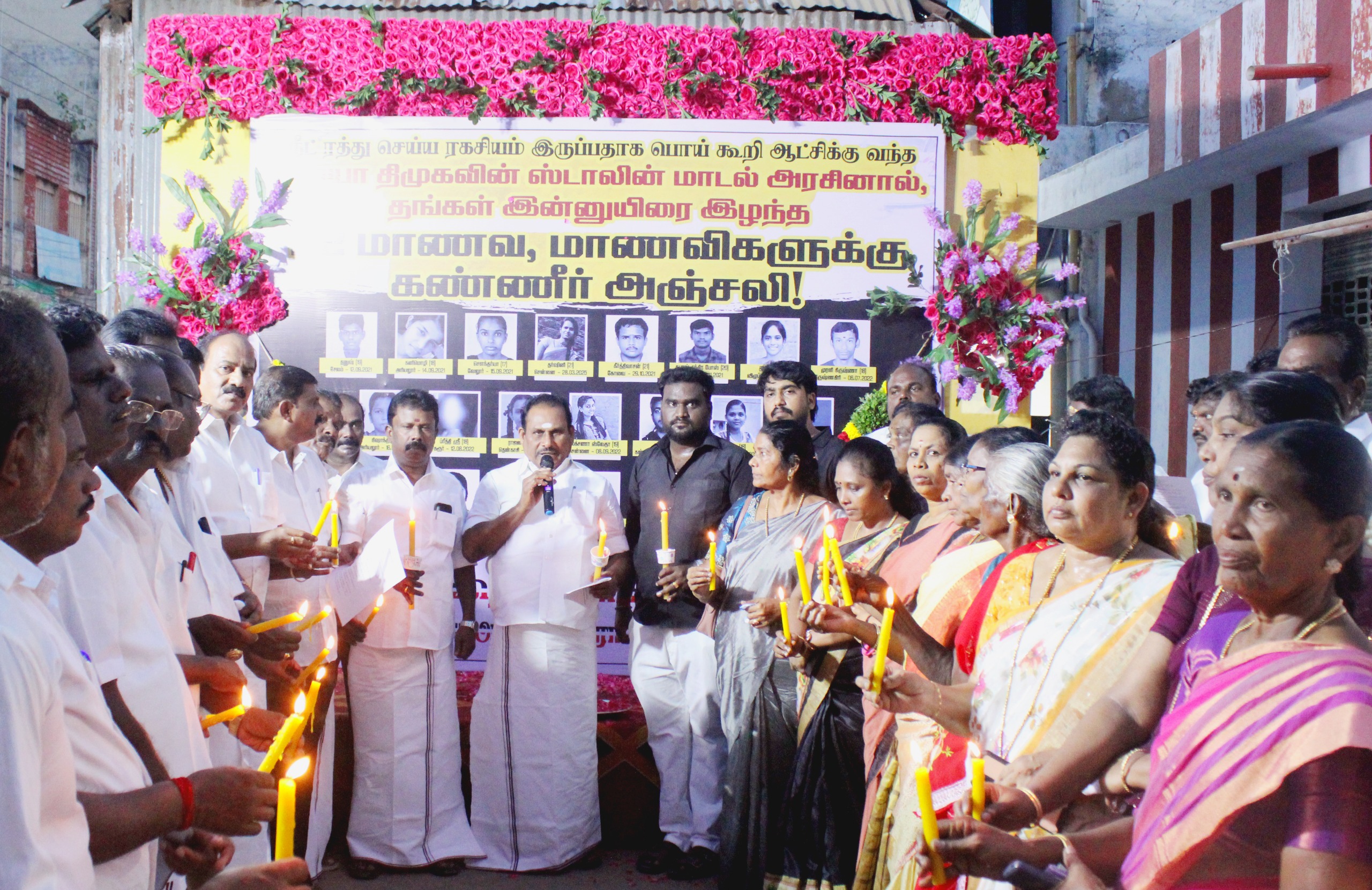 நீட் தேர்வு ரத்து என்ற திமுக பொய் வாக்குறுதியினால் இன்னுயிர் இழந்த மாணவர்களுக்கு அதிமுக மாணவர் அணி சார்பில் தூத்துக்குடியில் முன்னாள் அமைச்சர் எஸ்.பி.சண்முகநாதன் தலைமையில் மெழுகுவர்த்தி ஏந்தி கண்ணீர் அஞ்சலி.